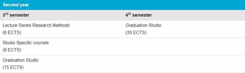 第三部分是研究生的三四学期。这两个学期的主要内容是为期一年的毕业设计。代尔夫特的毕业设计较为有特色,一般半年做研究,半年做设计,要求学生通过研究自主形成任务书,并根据任务书做设计。最后的设计阶段需要深入到细部节点设计。这一年会有一门必修课,专门教授学生如何进行建筑设计研究。