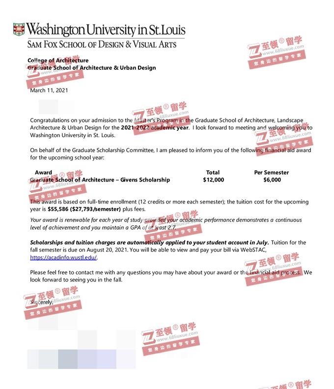 录取结果:WUSTL,MArch2圣路易斯华盛顿大学建筑学硕士录取+$12000