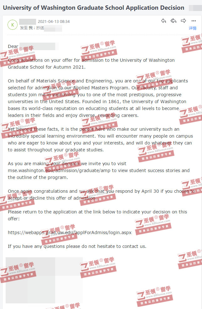 录取结果:UW(Seattle),MS in Materials Science and Engineering 西雅图华盛顿大学材料科学与工程硕士录取