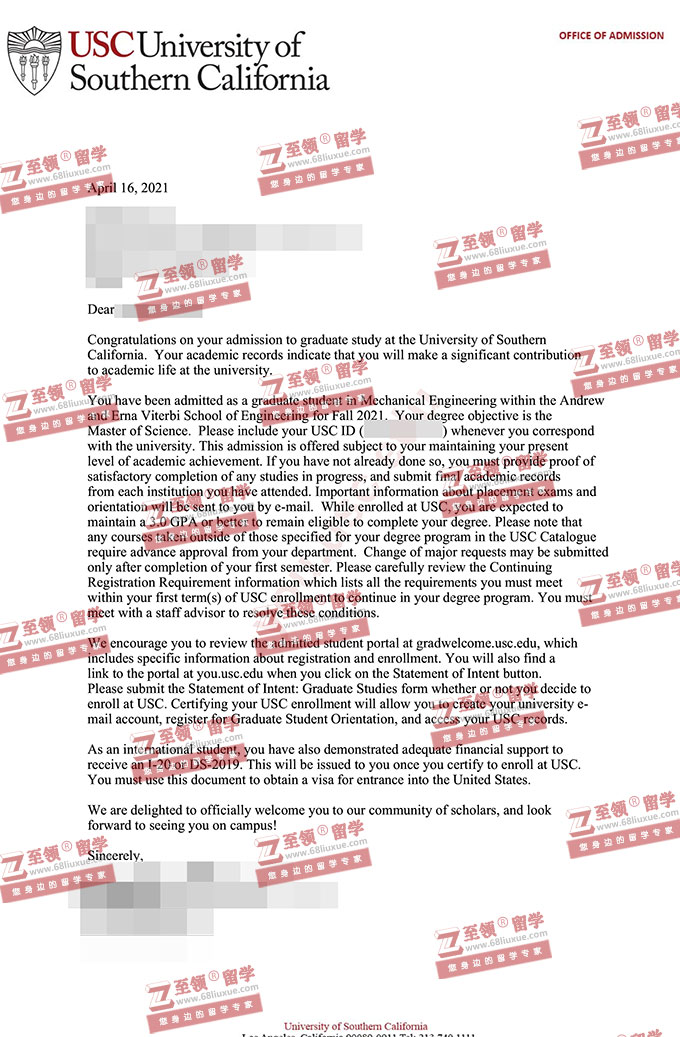 录取结果:USC,Master of Science in Mechanical Engineering南加州大学机械工程硕士录取