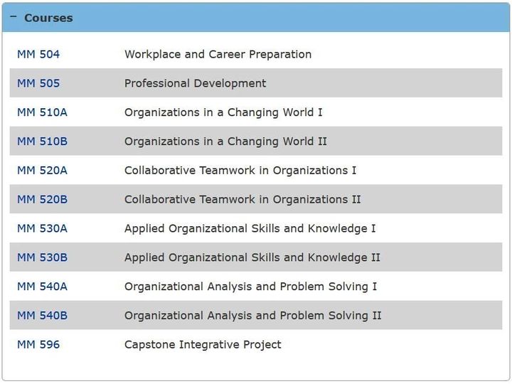 维多利亚大学管理学硕士课程共需要修16.5学分,每门课程1.5学分。具体课程如下: