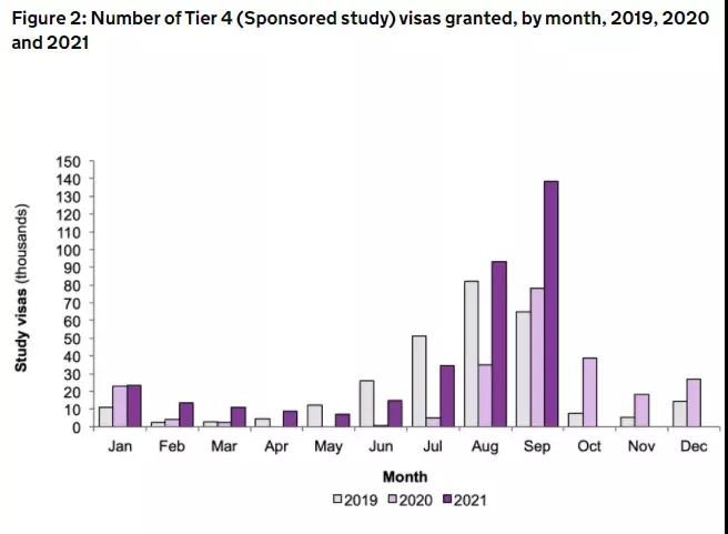 图2显示,受新冠疫情影响,2020年4月到5月期间英国发放的担保学生签证数量为零,5月之后开始恢复,并在之后的四个月内持续增加。而在2021年8月,英国发放的担保学生签证数量显著增加,并在2021年9月再度大幅增加,数量几乎达到2019年9月(疫情前)的两倍。