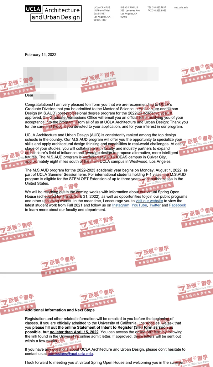 录取结果:UCLA,M.S. in Architecture and Urban Design 加州大学洛杉矶分校建筑与城市设计硕士录取