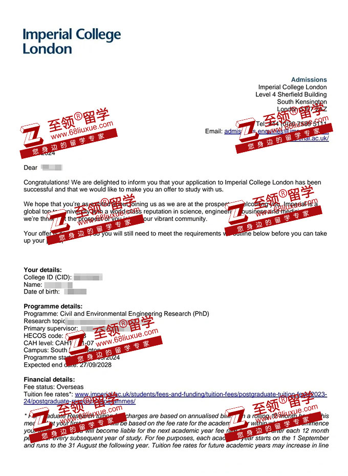 录取结果:Imperial College London,Civil and Environmental Engineering Research (PhD) 帝国理工学院土木工程PHD录取,免学费