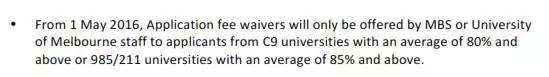对于提出免申请费需求的学生,需要满足C9大学平均分80%以上,985/211 大学85%以上。
