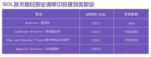 澳洲SOL清单中的建筑类职业清晰地表达了学习建筑专业对于将来移民澳洲的意义,如下图: