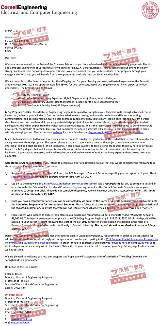 录取结果:Cornell University(康奈尔大学),Master of Engineering Degree (M.Eng.) in Electrical Engineering (电子工程硕士)
