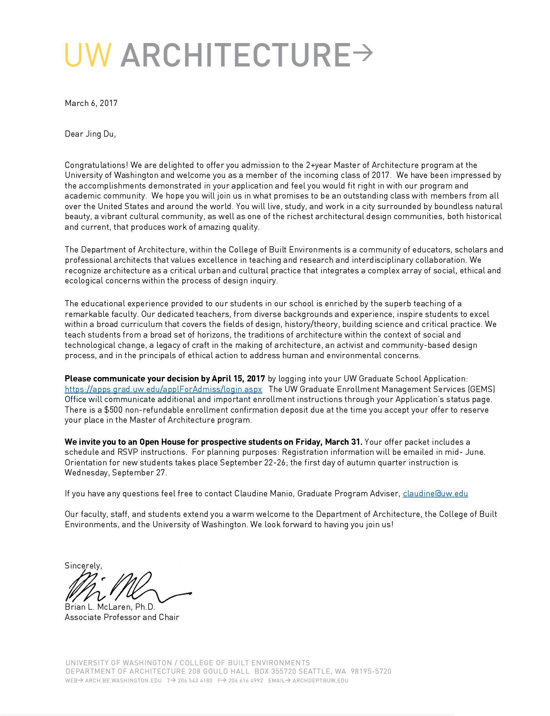 在申请材料寄出去不久,J同学收到了华盛顿大学建筑学硕士的录取通知,我们由衷地为他感到高兴。