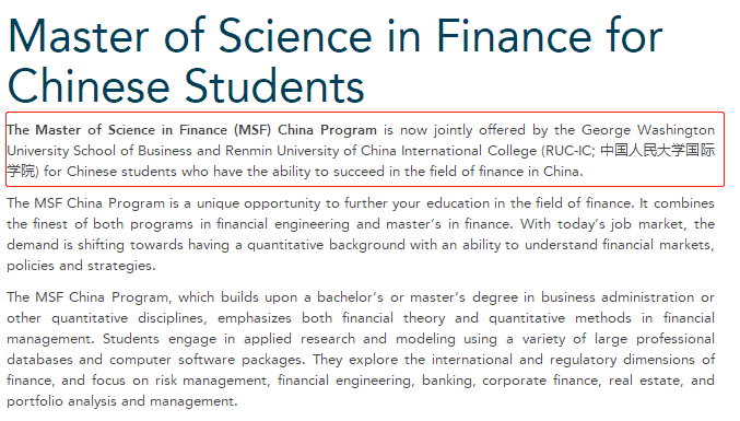 金融学硕士(MSF)中国项目现由乔治华盛顿大学商学院和中国人民大学国际学院(RUC-IC;中国人民大学国际学院)共同为有能力成功的中国学生提供在中国的金融领域。中国项目以工商管理或其他数量学科的学士或硕士学位为基础,强调财务理论和财务管理的定量方法。学生使用各种大型专业数据库和计算机软件包进行应用研究和建模。他们探索金融的国际和监管方面,并专注于风险管理,金融工程,银行,企业融资,房地产以及投资组合分析和管理。