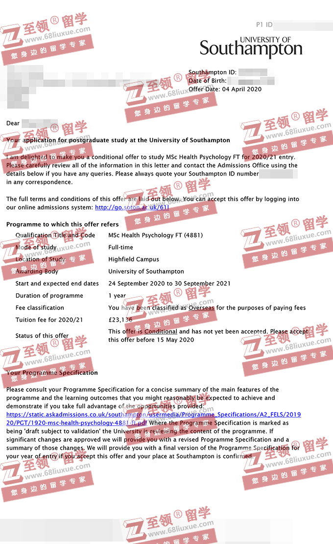 录取结果:University of Southampton,MSc Health Psychology南安普顿大学健康心理学硕士录取