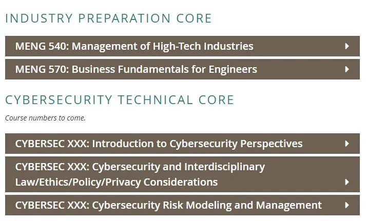 项目共需要修30个学分,10门课程,旨在培养有工程或计算机科学背景的学生,使其成为掌握网络安全技术、道德和商业知识的全面人才。