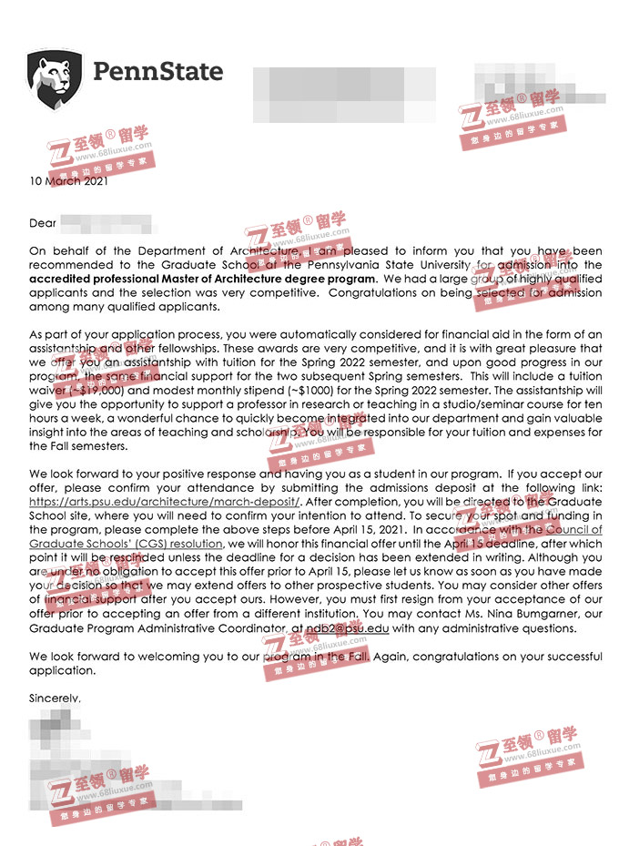 录取结果:PSU,Master of Architecture宾州州立大学建筑学硕士录取+奖学金$24197