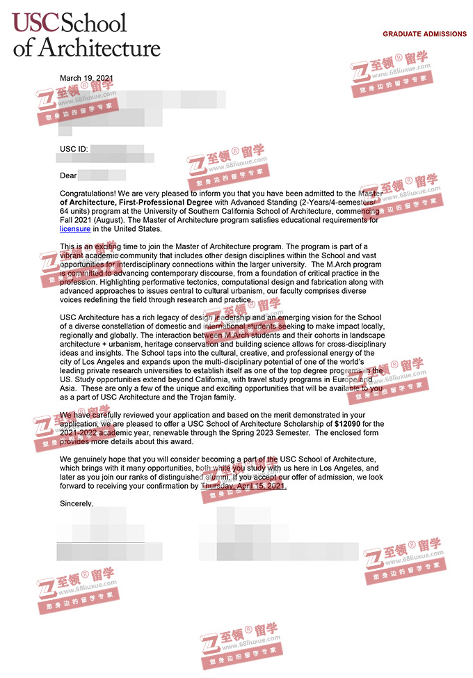 录取结果:USC,Master of Architecture, First-Professional Degree with Advanced Standing南加州大学建筑学硕士录取+$12090