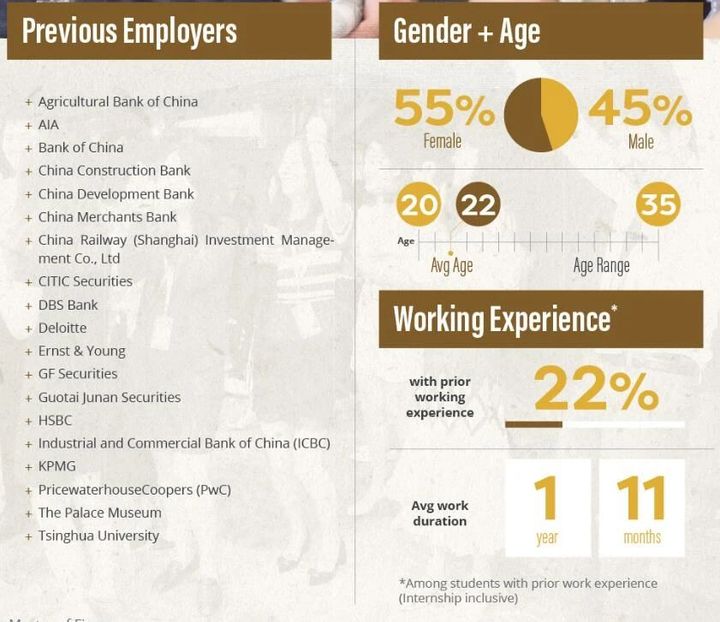 从上图我们可以看到:港大金融录取的主要还是以金融专业背景(42%)为主,其次是会计和经济背景(各占16%),商业/管理/营销专业背景占13%,理工科背景不到10%。这个说实话背景不够多样化,不知道是港大故意为之,还是非商科申请人数比较少。如果是非商科申请人数比较少,那么非商科背景(理工类)去申请可能会更有优势,因为学校可能有需求使学生背景多样化。