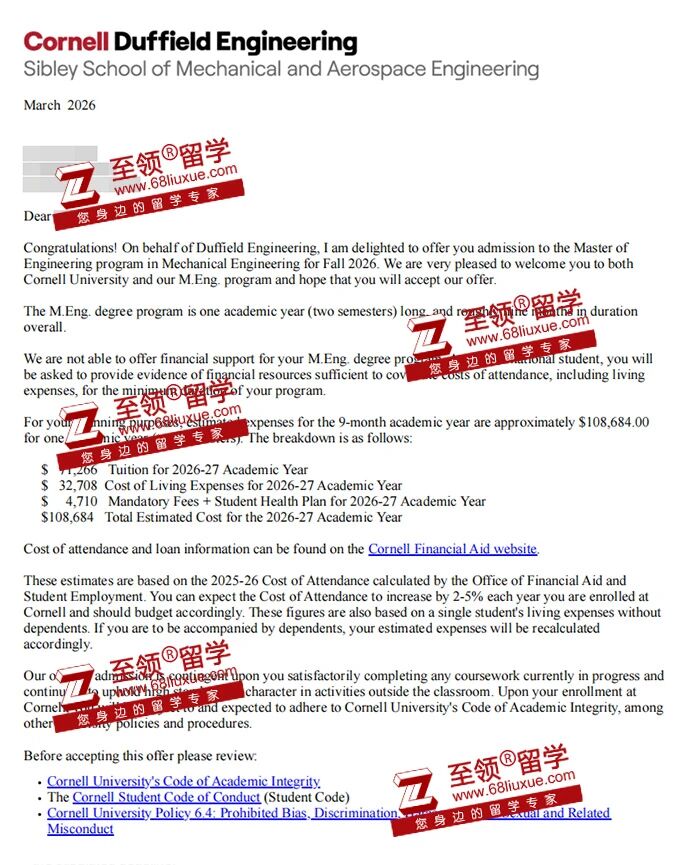 最终,在Z同学坚持不懈的努力以及至领留学团队精准的优势挖掘与系统化申请材料打造的共同助力下,他成功收获了来自康奈尔大学(Cornell University)机械与航空航天工程硕士项目(Mechanical and Aerospace Engineering)的录取,实现了从社区大学到常春藤名校的跨越。