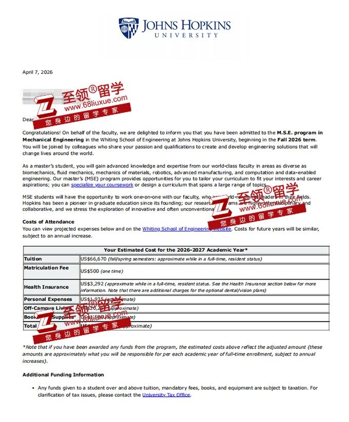 早规划加上精准的背景提升策略,让L同学成功弥补了复杂求学经历的短板,最终拿到约翰霍普金斯大学机械工程硕士的录取通知书。