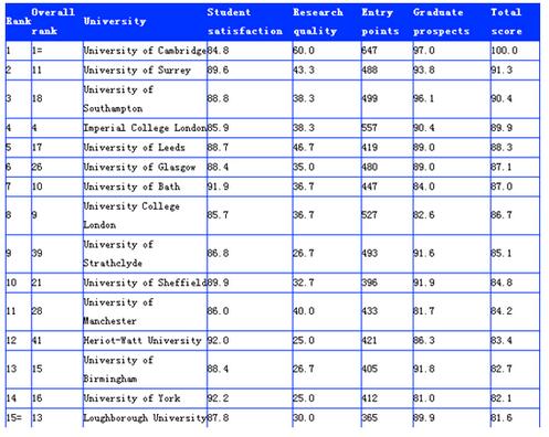 首先看一下2015年CUG 完全大学指南 电气与电子工程专业的排名情况。