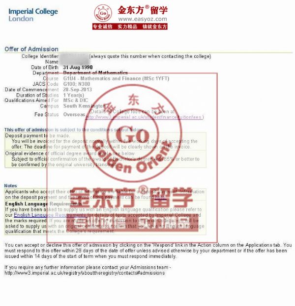 录取结果:英国帝国理工大学金融数学专业