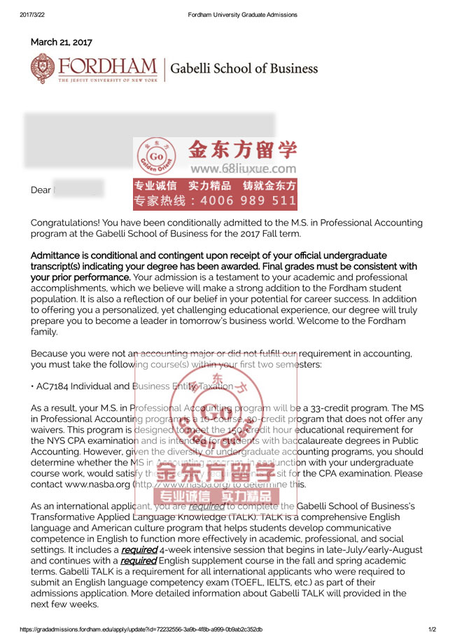 录取结果:Fordham University福特汉姆大学,Master of Science in Accounting会计硕士