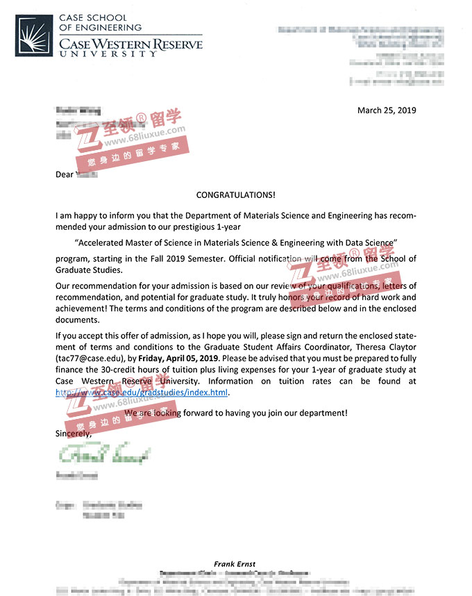 录取结果:Case Western Reserve University ,Accelerated Master of Science in Materials Science & Engineering 凯斯西储大学材料科学与工程硕士